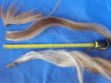 On larger tails it may still be possible to cut up to three lengths all about 1" wide down the tail. Depending on hair length and any colour variation a rocking horse mane may be made up of several lengths added together. A large tail with long hair may easily provide two or even three tails, each should be cut full width from the bottom of the tail, about two inches long.